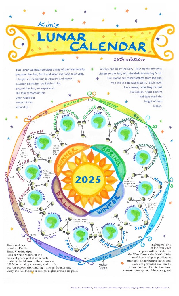 Since 1996, I have been designing and producing a lunar calendar that provides a map of the relationship between the Earth, Moon and Sun over the course of one year. The 2025 Lunar Calendar is featured below.